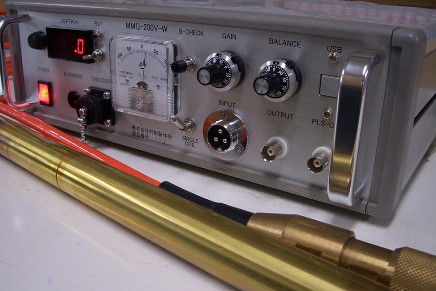 鉛直探査用センサーは外径φ25.4mmと小型で防水性が高く、細い調査孔での計測が短時間で行えます。また深度シーブとカウンタを内蔵した増幅器を用いて行いますので、目標物までの正確な深度を得られます。また鉛直探査実施時は専用の非磁性ステンレスロッドを使用して削孔します。